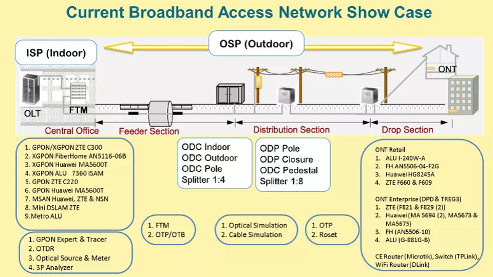 The infrastructure topology of the DDB Broadband Access Network Lab as an operational testbed for the Out Site Plan (OSP) or Optical Distribution Network (ODN) with facilities :