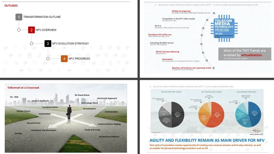 - End State - Full Virtualization (2023-2024+), dimana tidak ada legacy hardware pada akhir fase tersebut. Selain itu juga disampaikan apa saja challenge pada trasformasi NFV.