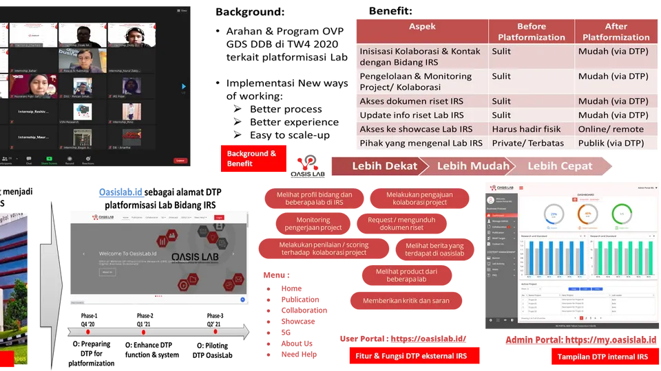 DTP Platformisasi Lab Bidang IRS terdiri atas 2 buah DTP yaitu DTP untuk user/ eksternal IRS (https://oasislab.id) dan DTP untuk internal IRS (https://my.oasislab.id). Beberapa fungsi yang dapat dilakukan melalui DTP ini diantaranya: